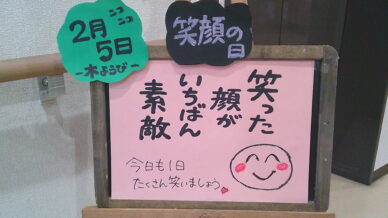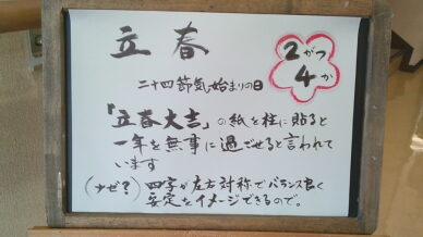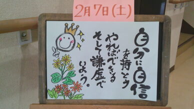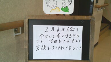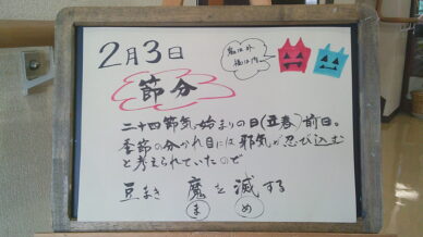 ウェルカムボード 毎朝、皆様をお迎えして最初に目にされるウエルカムボード。 「季節の話題」「心に響く言葉」「かわいい絵」「クイズ」「色々な分野のトリビア」などなど。 その日の担当スタッフの想いを込めたご挨拶です。